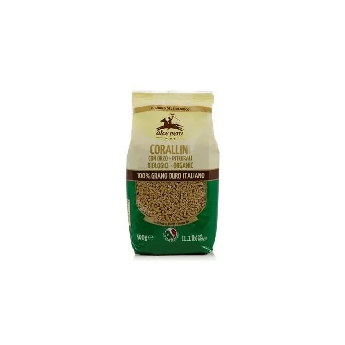 I Corallini Integrali con Orzo di Alce Nero sono prodotti con grano duro e orzo 100% italiani da agricoltura biologica. Ricchi di fibre, ideali per minestre e zuppe. Confezione da 500g.