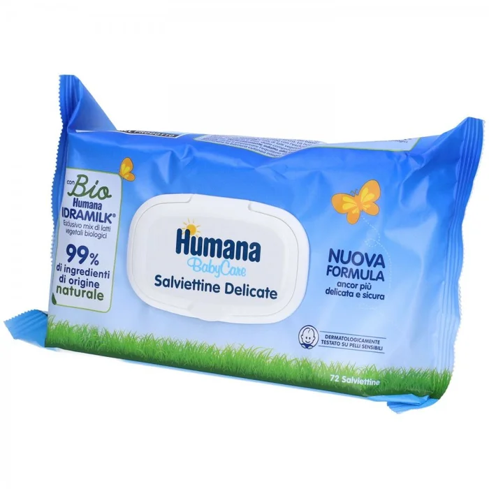 Humana HB Salviettine Umidificate, ideali per l’igiene quotidiana del tuo bambino e per pelli sensibili. Detergono delicatamente, rimuovendo impurità e mantenendo l’idratazione naturale. Senza alcool e parabeni, testate dermatologicamente, con pH fisiologico e profumazione leggera. Perfette per il cambio pannolino, viso e mani. Disponibili in confezioni da 72 pezzi. Scegli Humana HB per una pelle morbida e protetta, fin dai primi giorni di vita.